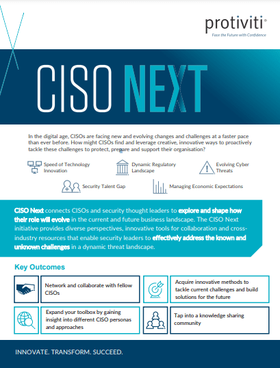 Protiviti’s CISO Next initiative provides diverse perspectives, innovative tools for collaboration and cross-industry resources that enable security leaders to effectively address the known and unknown challenges in a dynamic threat landscape.