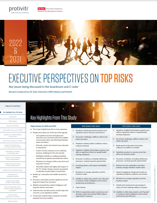 The top risks that CAEs identified for 2022 align closely with those ranked highly by board members and C-suite executives globally. Read more about these wide-ranging issues including succession challenges and the organisation’s ability to attract and retain top talent, cybersecurity threats, and more.